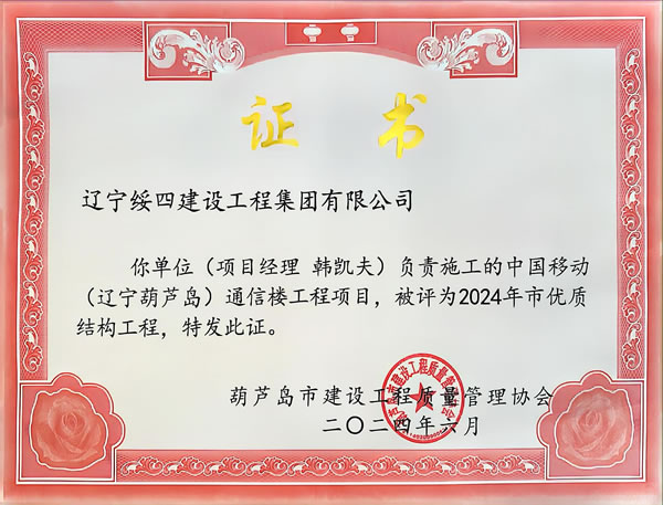 中國移動(遼寧葫蘆島)通信樓工程項目被評為2024年市優(yōu)質(zhì)結(jié)構(gòu)工程
