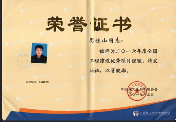 大會表彰了2016年度獲得全國優(yōu)秀施工企業(yè)稱號的單位并頒發(fā)了證書。我公司榮獲“2016年度全國優(yōu)秀施工企業(yè)”稱號,周桂山同志榮獲“全國工程建設優(yōu)秀項目經(jīng)理”稱號。