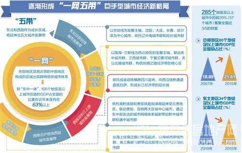 從城市層面GDP空間分布及變化來看,中國東中一體與“一網(wǎng)五帶”經(jīng)濟(jì)空間新格局進(jìn)一步凸現(xiàn)。主要表現(xiàn)在:第一,中心城市的經(jīng)濟(jì)集聚引領(lǐng)作用進(jìn)一步增強(qiáng),285個地級及以上城市中的前20%(57個城市)集聚全國近3/5的財富。第二,中部地區(qū)憑借中心城市的有力支撐正在不斷崛起,東北地區(qū)由于中心城市支撐作用下降而出現(xiàn)持續(xù)下滑。第三,“一網(wǎng)五帶”的“巨手型”城市中國經(jīng)濟(jì)空間格局進(jìn)一步顯現(xiàn)。東中部多中心城市群網(wǎng)中106個地級及以上城市創(chuàng)造的GDP占全國的比重在近年來保持在63%以上。西線沿長江上游城市發(fā)展帶GDP比重持續(xù)增加,2015年達(dá)到了6.28%,有趕超東北沿京哈線城市發(fā)展帶的可能。西北沿隴海蘭新線城市發(fā)展帶、西南沿滬昆線西段城市發(fā)展帶、南線沿海城市發(fā)展帶在全國的GDP比重盡管相對較小,但總體上呈增加趨勢。