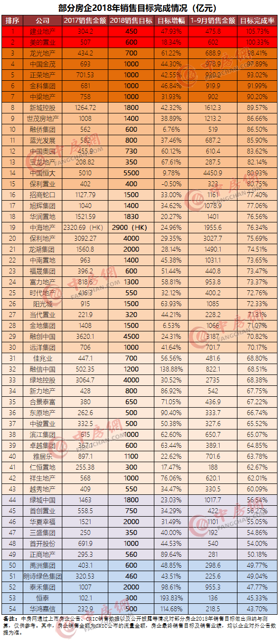 具體來看,建業(yè)地產(chǎn)和美的置業(yè)兩家房企已經(jīng)超額完成全年銷售任務(wù),目標完成率分別為:105.73%和100.33%。