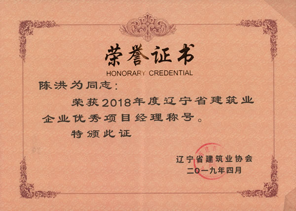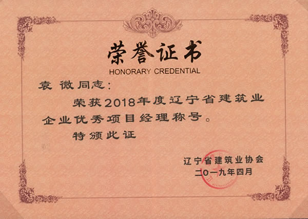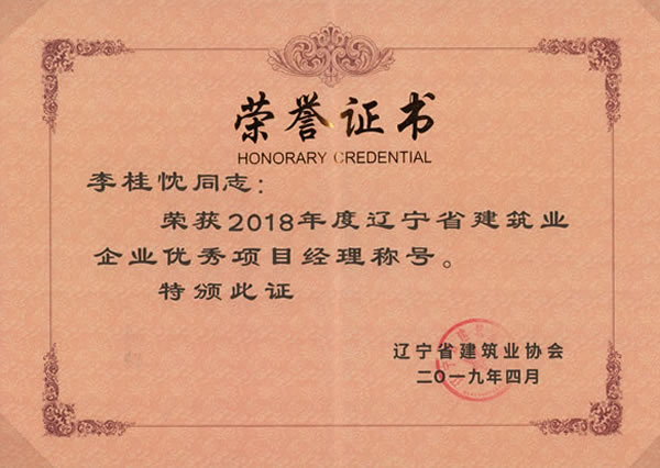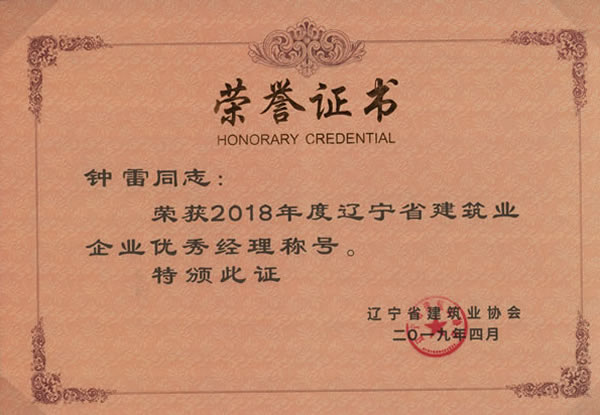 2019年5月22日,從遼寧省建筑業(yè)協(xié)會獲悉,我集團榮獲2018年度“遼寧省建筑業(yè)優(yōu)秀企業(yè)”稱號。副總經理鐘雷同志榮獲“遼寧省建筑業(yè)企業(yè)優(yōu)秀經理”稱號,項目經理李桂忱、陳洪為、袁微三名同志榮獲“遼寧省建筑業(yè)企業(yè)優(yōu)秀項目經理”稱號。