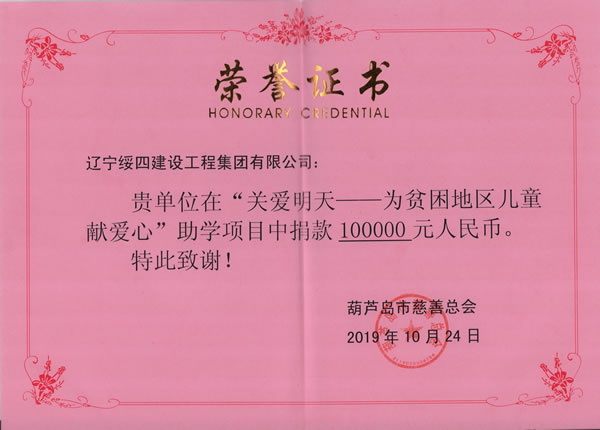2019年10月24日,我集團(tuán)積極參與葫蘆島市教育局、葫蘆島市民政局、葫蘆島市慈善總會“關(guān)于開展‘關(guān)愛明天——為貧困地區(qū)兒童獻(xiàn)愛心’公益活動的倡議”活動,捐款人民幣拾萬元整。