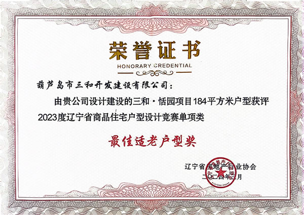 本次競賽以“好房子服務美好生活”為主題,活動一經發(fā)布,我單位市場開發(fā)副總凌旭作為主要設計人,聯合其它設計人員積極申報戶型設計方案。經過專家評審,我單位獲得1項綜合類獎、2項單項類獎。其中,應用于三和榮郡居住小區(qū)二期工程的135平方米戶型,榮獲綜合類“優(yōu)秀戶型獎”;應用于三和宜興園小區(qū)工程的85平方米戶型,榮獲單項類“最佳青年戶型獎”;應用于三和恬園小區(qū)二期工程的184平方米戶型,榮獲單項類“最佳適老戶型獎”。