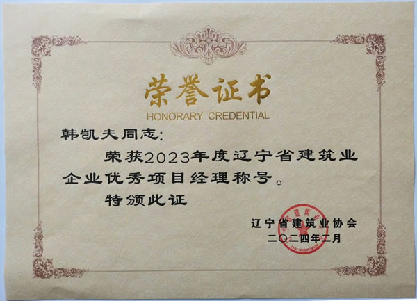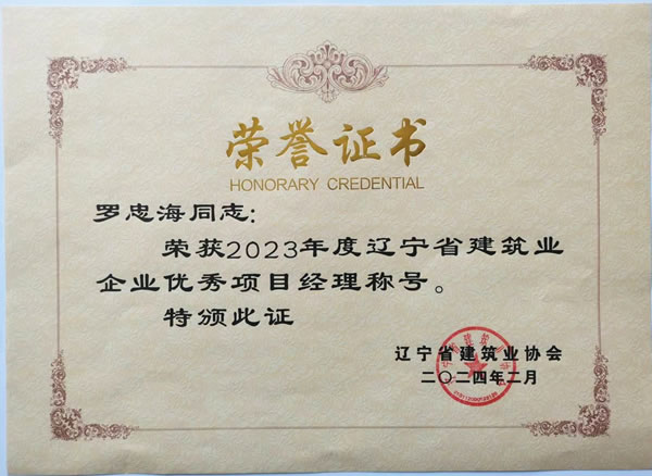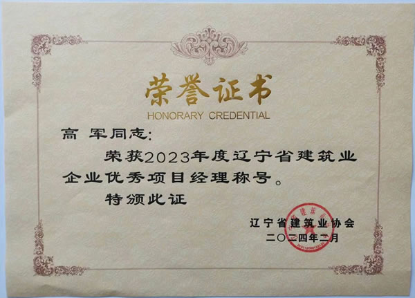 遼寧綏四建設(shè)工程集團(tuán)有限公司的高軍、羅忠海、韓凱夫三名同志被評為2023年度遼寧省建筑業(yè)企業(yè)優(yōu)秀項目經(jīng)理,并于2024年5月獲得遼寧省建筑業(yè)協(xié)會頒發(fā)的榮譽(yù)證書。