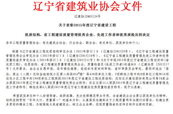 根據(jù)《遼寧省建設(shè)工程優(yōu)質(zhì)結(jié)構(gòu)審定辦法(2015年修訂)》(遼建協(xié)[2015]9號(hào))、《遼寧省工程建設(shè)質(zhì)量管理優(yōu)秀企業(yè)審定辦法(2015年修訂)》(遼建協(xié)[2015]10號(hào))文件精神,由企業(yè)自愿申報(bào),市擇優(yōu)推薦審核,省評(píng)審委員會(huì)審定,遼寧綏四建設(shè)工程集團(tuán)榮獲以下榮譽(yù)和獎(jiǎng)項(xiàng): 。ㄒ唬┻|寧綏四建設(shè)工程集團(tuán)有限公司被評(píng)為2015年度遼寧省工程建設(shè)質(zhì)量管理優(yōu)秀企業(yè)。 。ǘ┘瘓F(tuán)榮獲省優(yōu)質(zhì)主體結(jié)構(gòu)獎(jiǎng)項(xiàng)工程: 1、綏中縣全民健身活動(dòng)中心; 2、葫蘆島市龍港區(qū)兩河三村回遷樓改造二期一標(biāo)段1#樓; 3、葫蘆島市龍港區(qū)兩河三村回遷樓改造二期一標(biāo)段2#樓; 4、葫蘆島三和榮郡1#住宅樓; 5、葫蘆島三和榮郡2#住宅樓; 6、葫蘆島三和榮郡3#住宅樓; 7、葫蘆島三和榮郡4#住宅樓; 8、葫蘆島三和榮郡5#住宅樓; 9、葫蘆島三和榮郡6#住宅樓; 10、葫蘆島三和榮郡7#住宅樓; 11、葫蘆島三和榮郡8#住宅樓; 我集團(tuán)將繼續(xù)認(rèn)真落實(shí)住建部關(guān)于工程質(zhì)量?jī)赡曛卫硇袆?dòng)要求,創(chuàng)建出更多更好的精品工程,樹(shù)立企業(yè)品牌,為做強(qiáng)做大遼寧省建筑業(yè)的宏偉目標(biāo)作出新的貢獻(xiàn)。