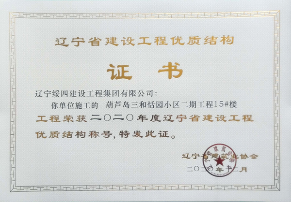 “葫蘆島三和恬園小區(qū)二期工程15#樓”榮獲2020年度遼寧省建設(shè)工程優(yōu)質(zhì)結(jié)構(gòu)稱號