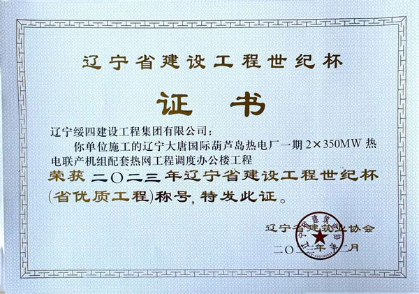 遼寧大唐國際葫蘆島熱電廠一期2×350MW熱電聯(lián)產(chǎn)機(jī)組配套熱網(wǎng)工程調(diào)度辦公樓工程 榮獲2023年遼寧省建設(shè)工程世紀(jì)杯(省優(yōu)質(zhì)工程)稱號(hào)